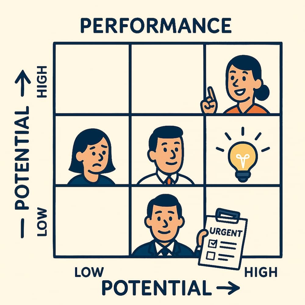 - Box 5 (Moderate Potential, Moderate Performance): These employees are “solid performers” with moderate potential. Development should aim to maintain performance and explore potential for higher roles.