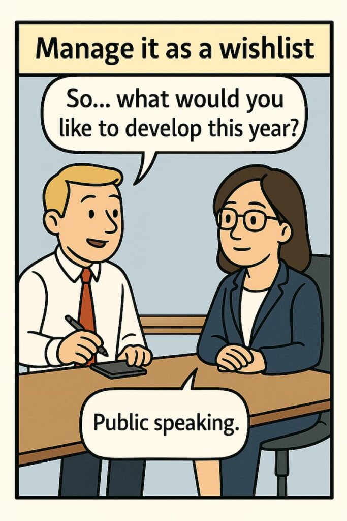 To eliminate the wishlist mindset, start by assessing real competency gaps instead. You have many tools for this, including my 360 Leadership assessment tool, which you can fully customise to match your own competency framework.