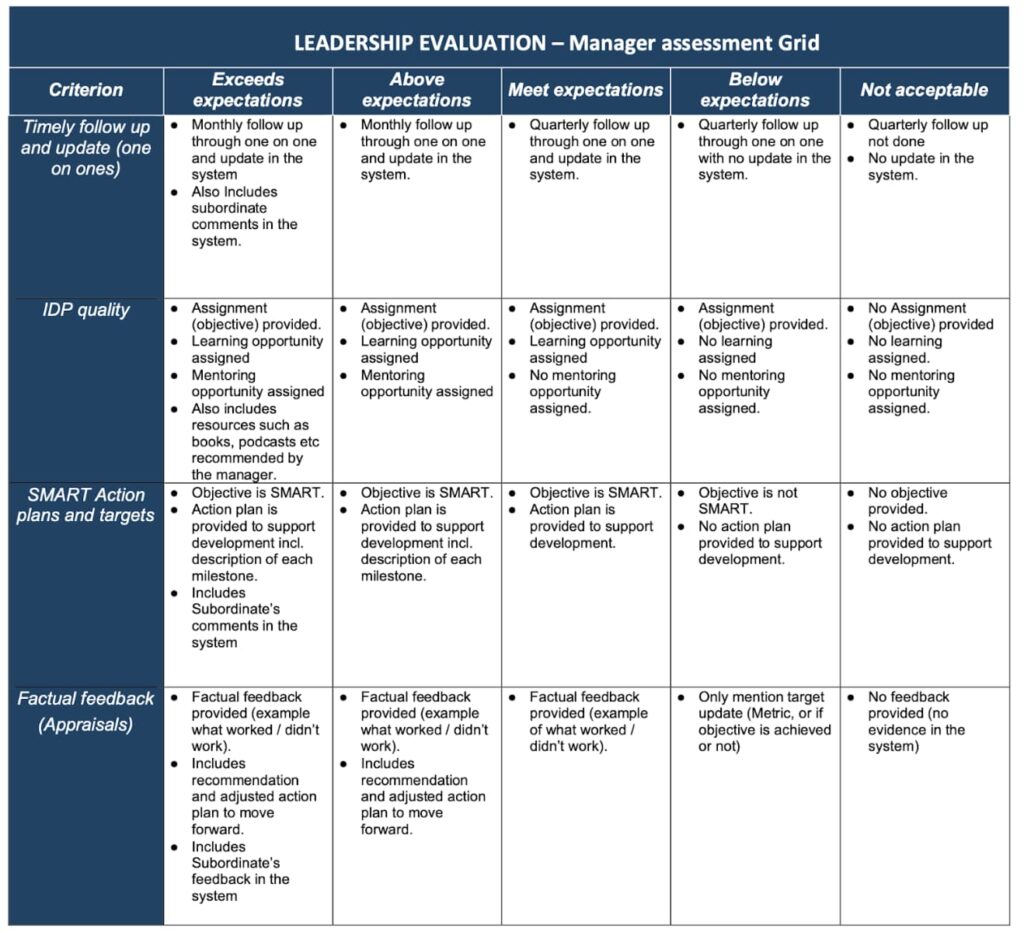 Next, I am sharing my control sheet as an example of what I call the manager KPI. This tool helped me fix several recurring HR issues and ensure real implementation with managers. I used to implement the “manager KPI” in my previous organisation to control the above. I am sharing it here, knowing that it can be adapted to different organisations. The principle of it is that if you are a manager, you need to know how to manage, so you have a manager KPI. As a matter of fac,t it was easy to convince my CEO about this initiative at the time. And since we wanted consistency, we went with it.